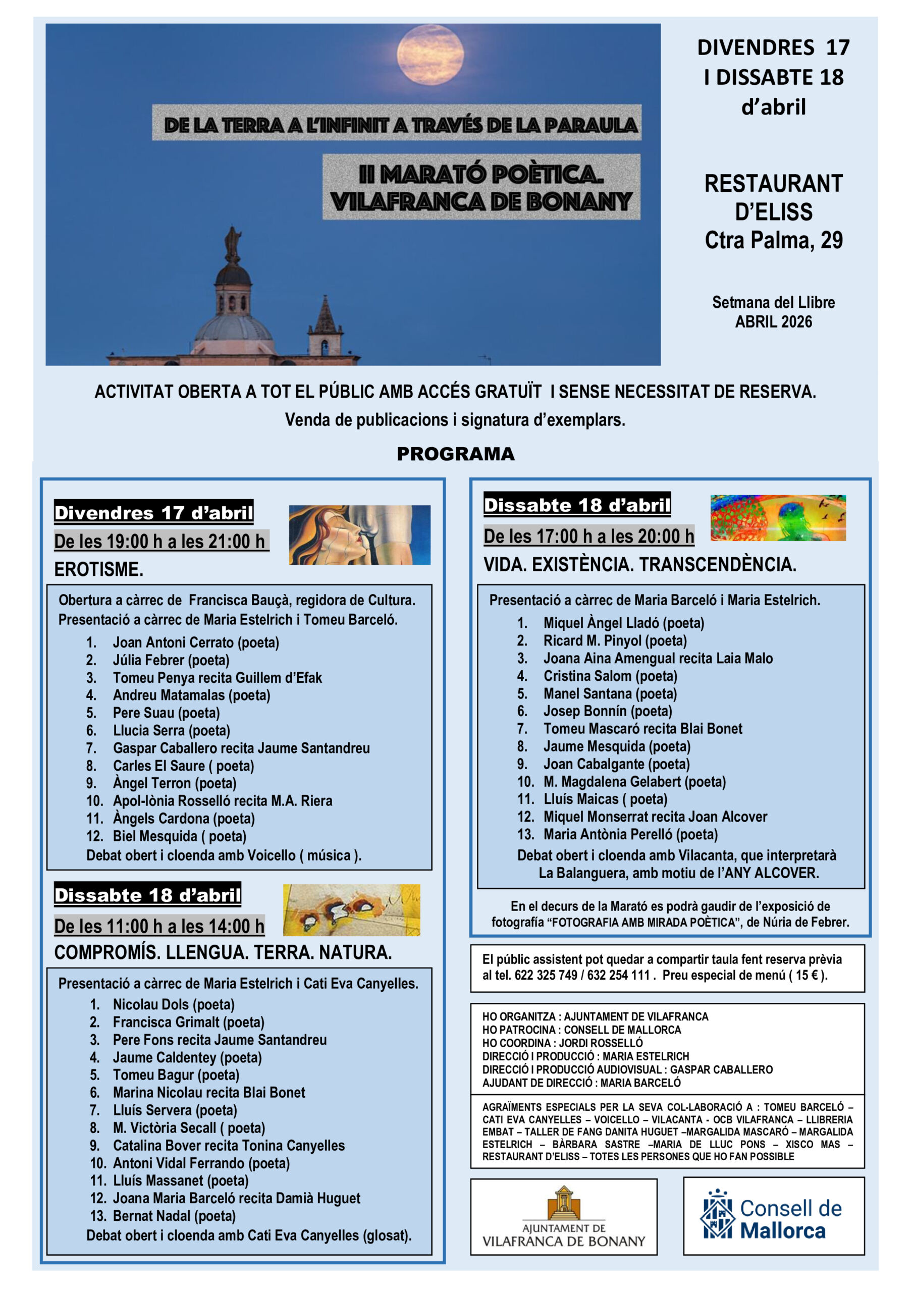 La II MARATÓ POÈTICA és organitzada per l’Ajuntament de Vilafranca i compta amb el suport del Consell de Mallorca i es troban dins el marc del PROGRAMA DE LA SETMANA DEL LLIBRE.