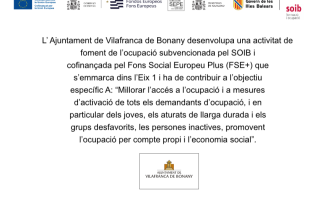 El Ajuntament de Vilafranca de Bonany pondrá en marcha el programa «SOIB Reactiva 2024», promovido por el SOIB y con la financiación de la Unión Europea (FSE+) con una aportación de 66.362,80 €, con el objectivo de fomentar la contratación de persones jóvenes (mayores de 16 y menores de 30 años) desocupadas, con estudios básicos obligatorios cómo máximo y personas desocupadas, de 30 años o más, preferentemente en situación de