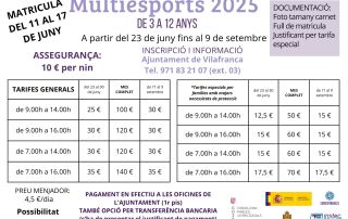 Multiesports 2025, del 23 de juny al 9 de setembre. Nins i nines de 3 a 12 anys. Matrícula del 11 al 17 de juny a les oficines municipals (Ajuntament de Vilafranca, Plaça Major, 1) Informació important MULTIESPORTS VILAFRANCA 25 Fitxa inscripcions a Multiesports ESTIU 2025