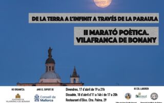 Divendres 17 i dissabte 18 d'abril al Restaurant d'Eliss (Ctra Palma, 29) DE LA TERRA A L'INFINIT A TRAVÉS DE LA PARAULA Després de l’èxit de l’any passat, enguany torna la Marató Poètica en tres sessions en què poetes, de renom i emergents, recitaran alguns dels seus poemes, i en què també diferents rapsodes, tots i totes de Vilafranca, recitaran poemes d’altres autors/es contemporanis - enguany, amb especial atenció a