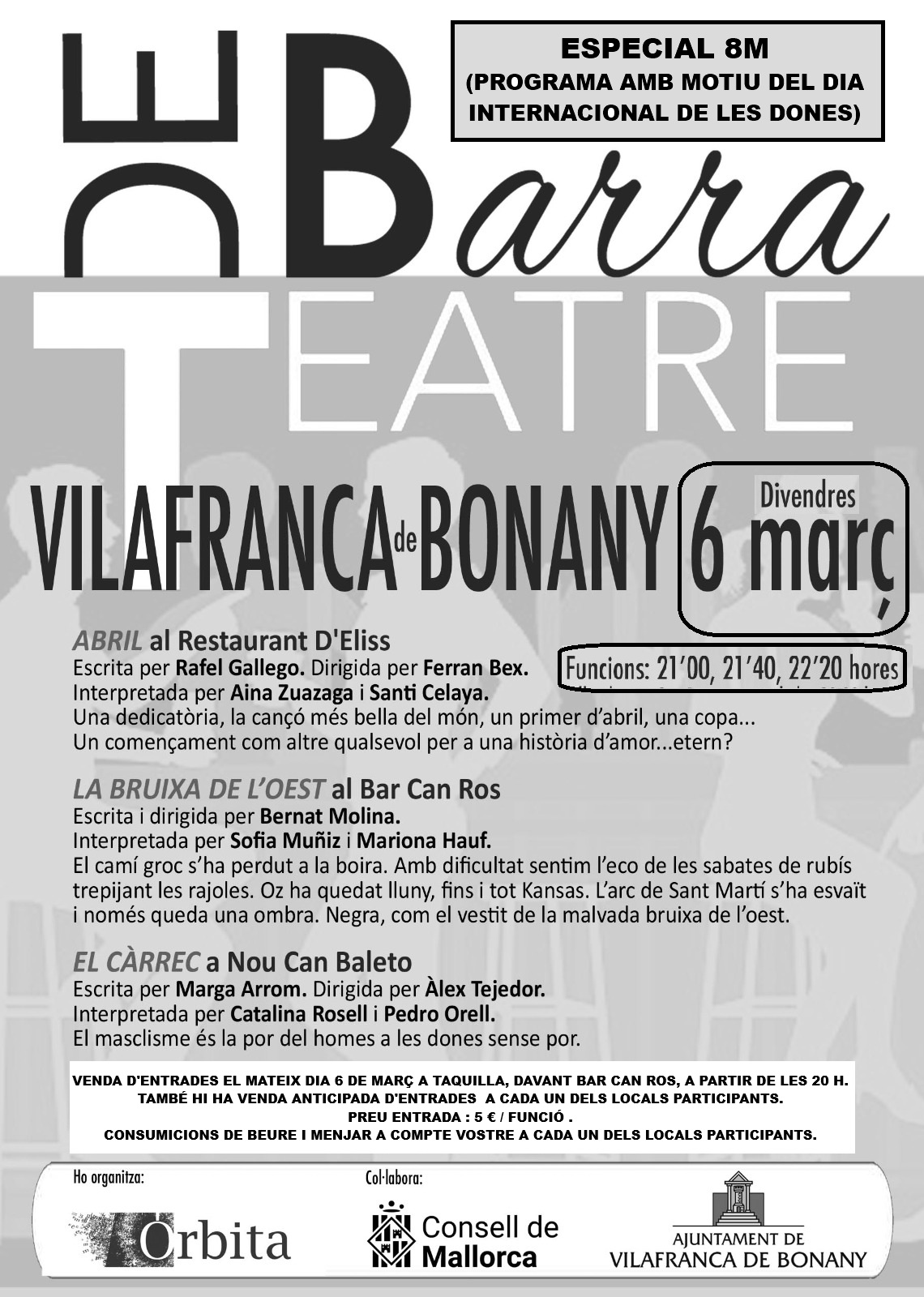 També us adjuntam CARTELL DE L’ESPECIAL 8M DEL TEATRE DE BARRA del dia 6 de març, amb les SINOPSIS DE LES OBRES. ( JPG)